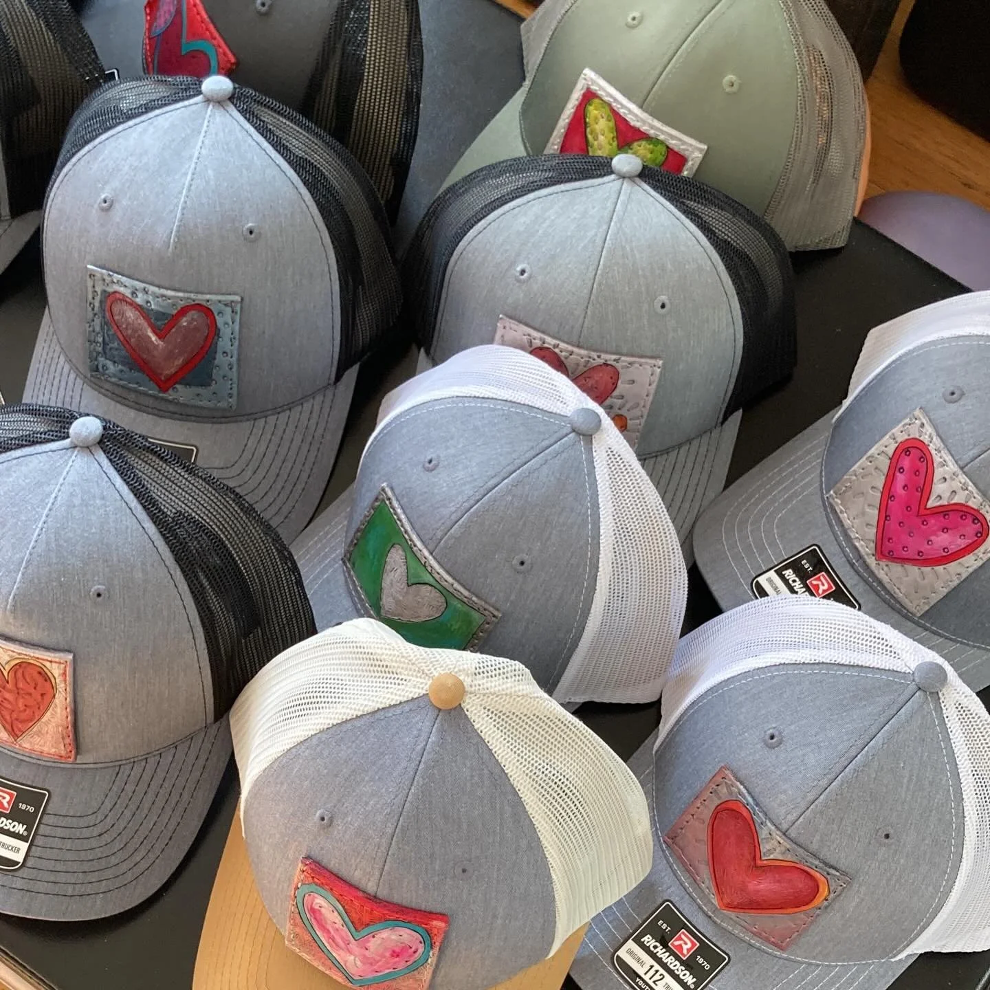 Hand-carved and painted heart detail in white, pink, orange, and black
