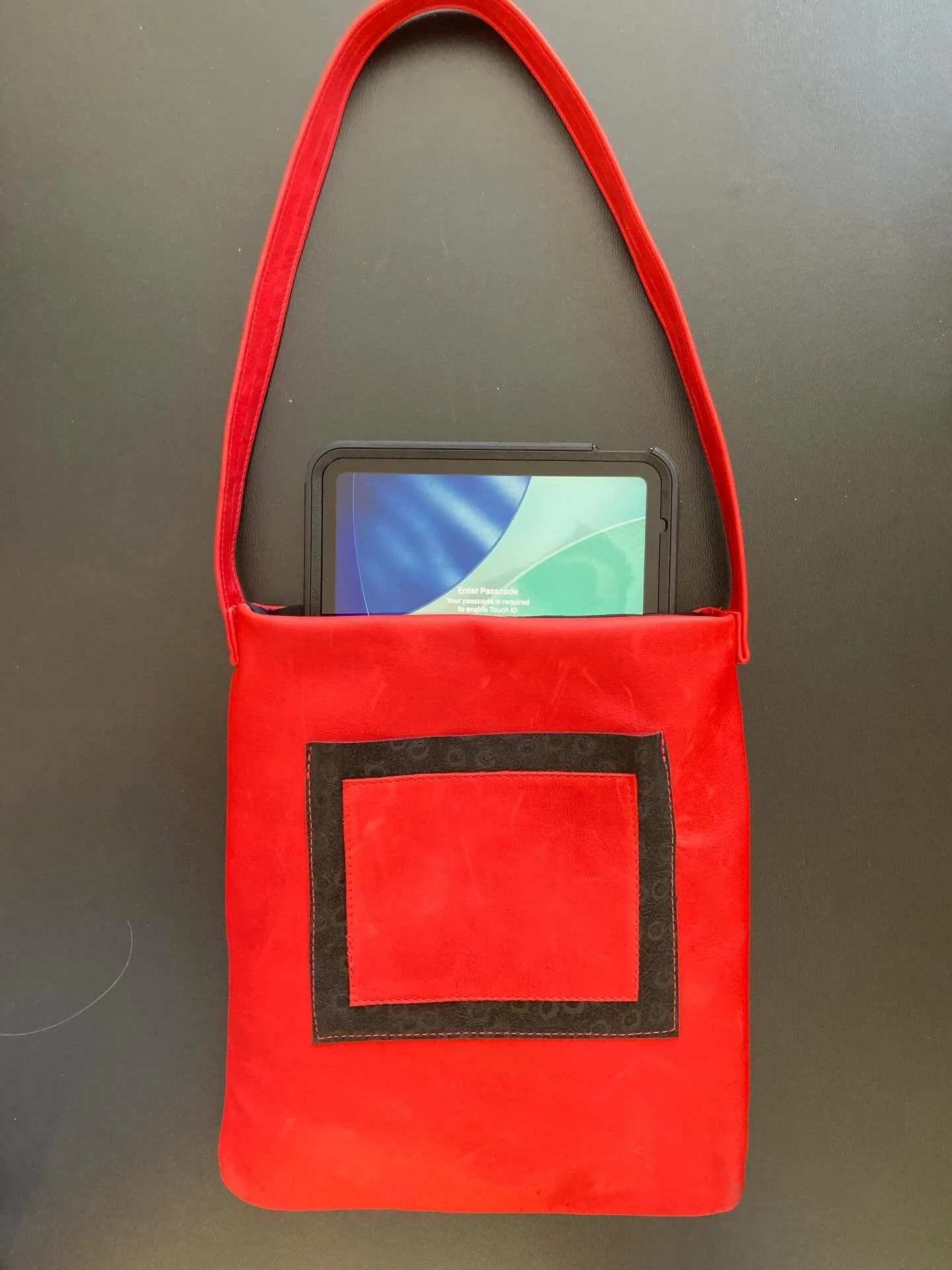 A bold fusion of artisan craftsmanship and purposeful design. This one-of-a-kind iPad bag features rich red leather with a black emu and red leather pocket detail, creating a powerful contrast that is visually distinctive and functional.